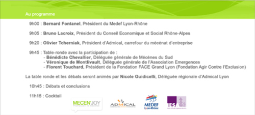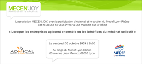 L’association Mecen’joy, avec la participation d’Admical et le soutien du Medef Lyon-Rhône organise une matinale sur le thème : «Lorsque les entreprises agissent ensemble ou les bénéfices du mécénat collectif» Sous la présidence de Bruno Lacroix, Président du Conseil Economique et Social de la région Rhône-Alpes, et accompagné d’Olivier Tcherniak, Président d’Admical (Carrefour du mécénat d’entreprise), cette rencontre sera l’occasion de débattre du mécénat et de ses relations avec les entreprises et le territoire. Rendez-vous le vendredi 30 octobre 2009 de 9H à 12h au siège du Medef Lyon-Rhône.