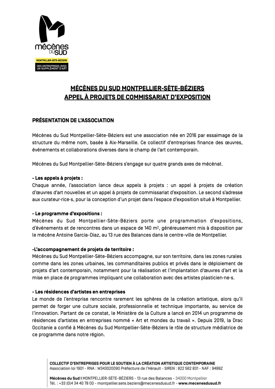 - Si cela est nécessaire, le·la commissaire devra savoir développer des partenariats pour la réalisation d’œuvres spécifiques et sera aidé·e dans cette mission par la déléguée générale de Mécènes du Sud Montpellier-Sète-Béziers.
