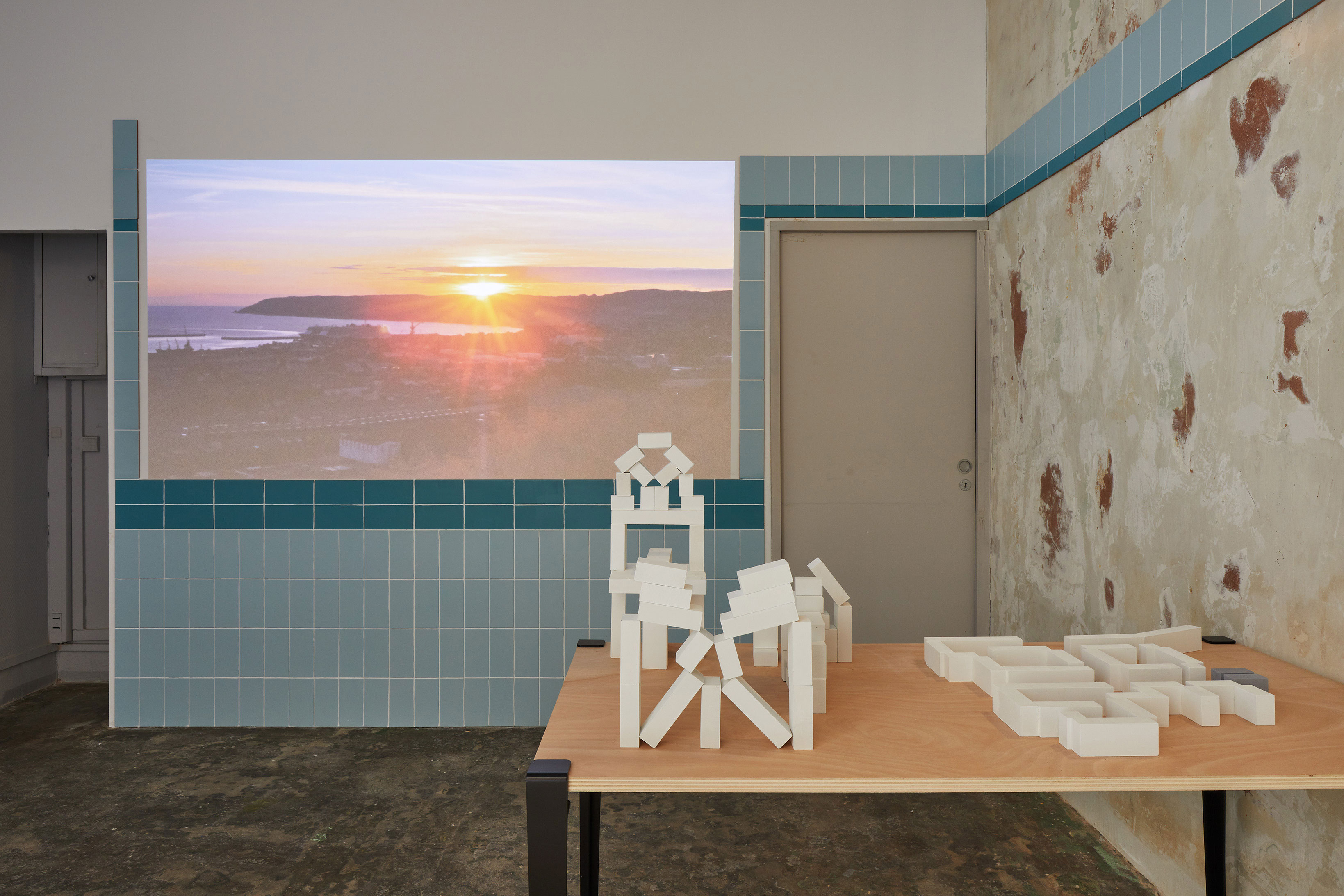 B.C. : Le belvédère, titre de la vidéo, est la pièce centrale de l’exposition. Il s’agit d’une vue panoramique sur une rade et ses îles, balayée par un mouvement de caméra régulier, interrompu par un carrousel d’images fixes, des détails de ce paysage. Nous venons de la mer mais nous vivons sur terre. L’île est-elle l’entre-deux ?
